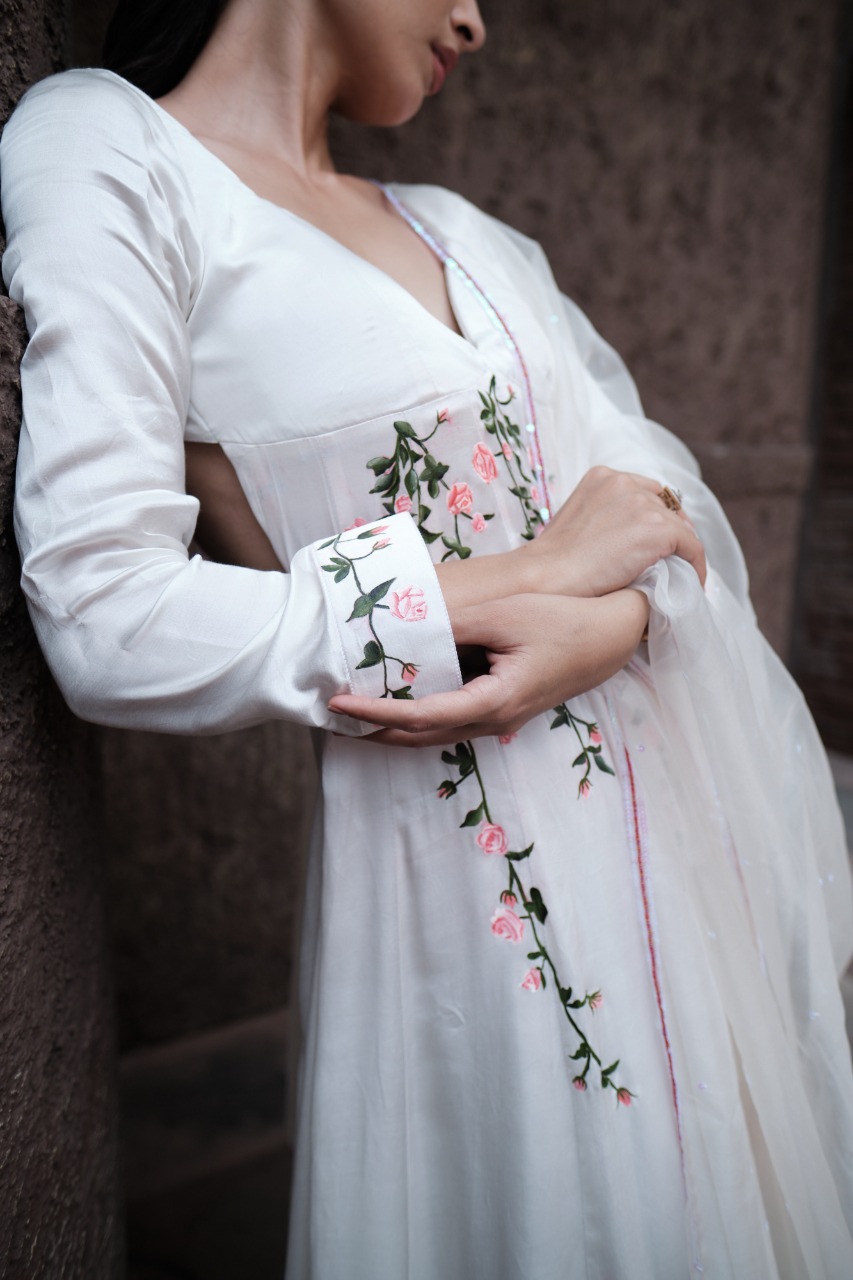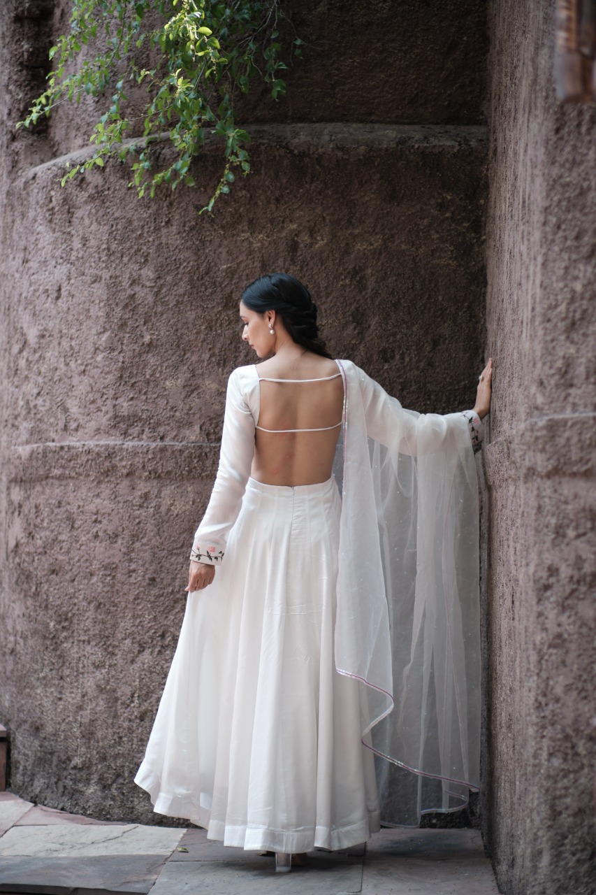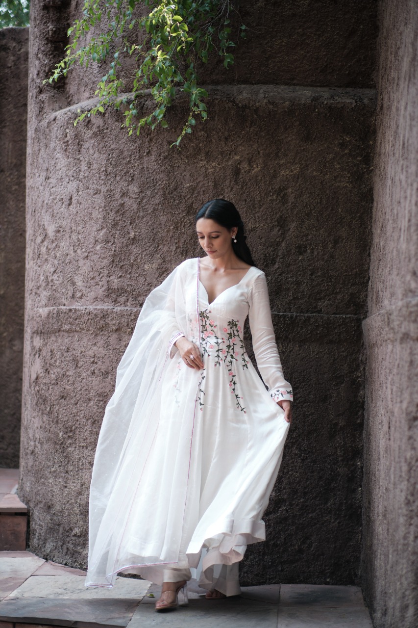 ANARKALI – Kalidar Anarkali With Hanpainted Delicate Vintage Rose Vines With A Deep Sweetheart Neck And Padded Bust.deep Open Back With Zip Closure , Giving You A Sultry And Sexy Silhouette.