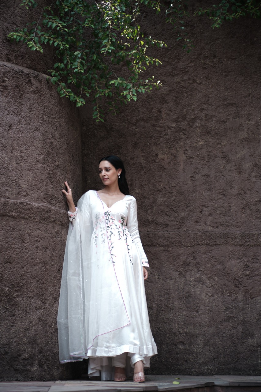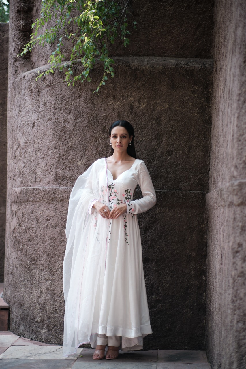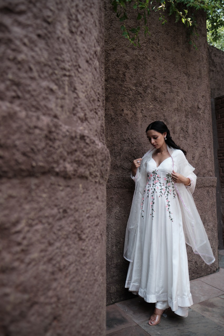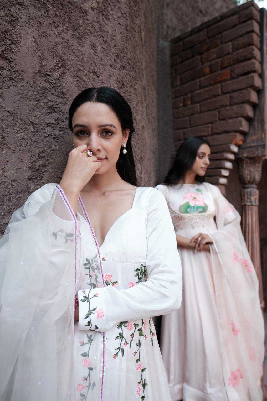 ANARKALI – Kalidar Anarkali With Hanpainted Delicate Vintage Rose Vines With A Deep Sweetheart Neck And Padded Bust.deep Open Back With Zip Closure , Giving You A Sultry And Sexy Silhouette.